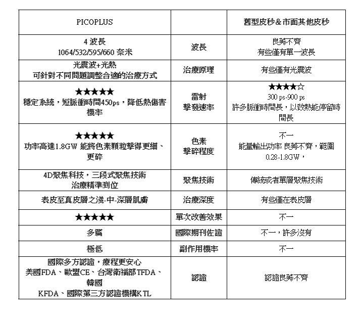 研究顯示,東方人皮膚中的黑色素母細胞較歐美人活躍,雷射治療容易引發色素沉澱異常(俗稱:反黑)。4D皮秒PICOPLUS擁有450極短脈衝輸出,能夠讓雷射停留在肌膚的時間更短,降低表皮損傷及色素沈澱風險,且功率高達1.8G,比一般市面皮秒輸出功率更高,能夠將色素斑或刺青染料粒子擊碎為更細的粉塵,減少熱傷害所產生的反黑副作用機率,是一台適合東方亞洲膚質,兼具安全與有效性的皮秒雷射。